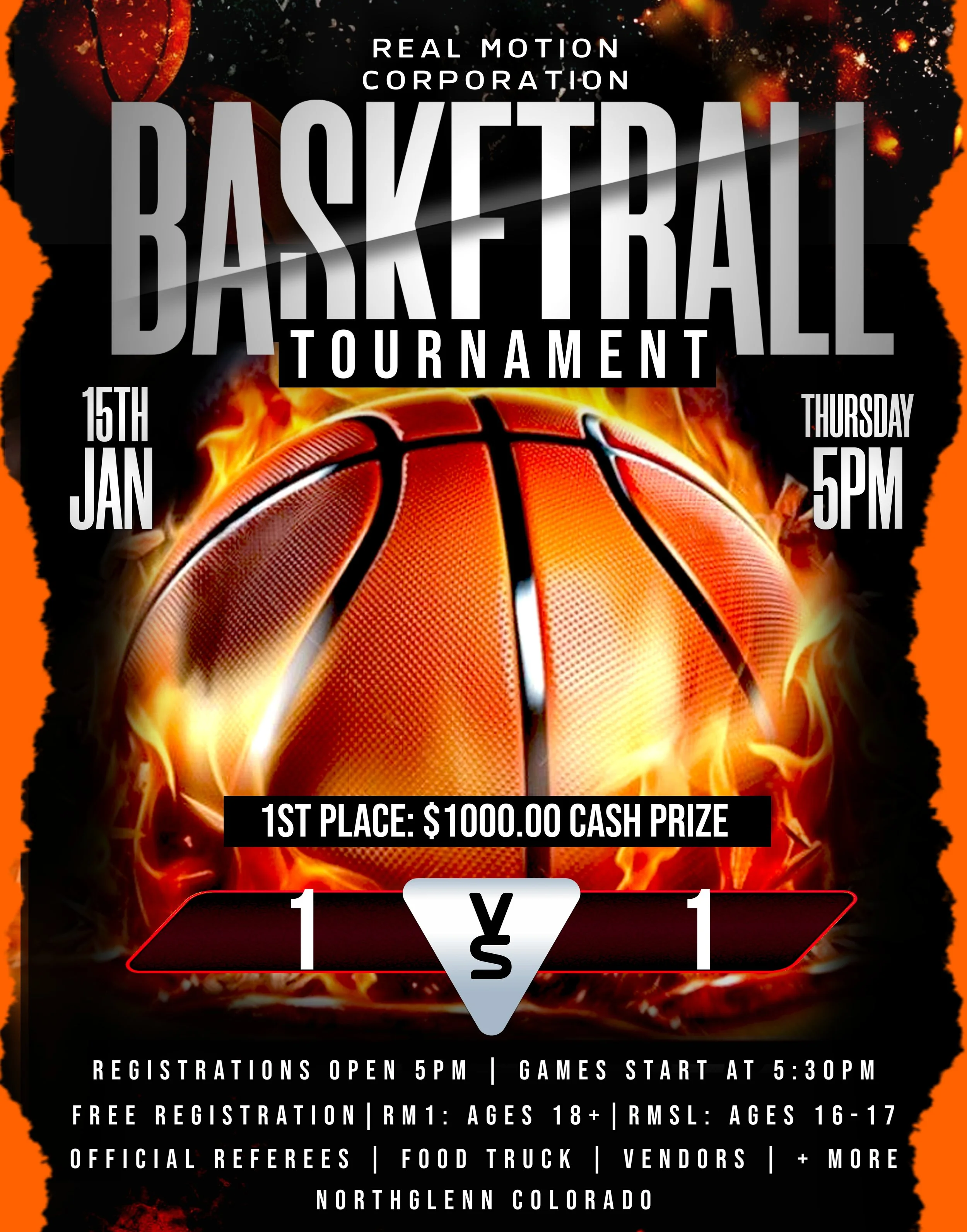 At the Real Motion Monthly Streetball Tournaments Participants who are 18+ will compete in the RM1 Division, and Participants ages 15-17 will compete in the Real Motion Scholarship League Division.